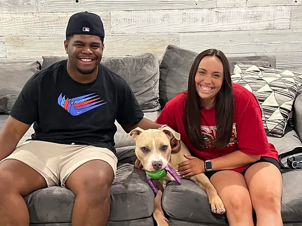 In July 2023, Lost & Found Animal Foundation was contacted by a wonderful couple regarding a young Pit Bull named Sterling who spent much of his life in a very small kennel that he outgrew over time. As he was never walked and was crammed in a tight space daily, Sterling developed mobility issues and could hardly walk. Concerned about Sterling and his quality of life, the couple asked if we could find him a new permanent home and offered to foster him in the meantime. At 70 pounds, Sterling still needed vaccines and neutering, so we immediately took care of his medical needs before we began searching for people willing to give Sterling a new chance in a loving environment where he could thrive. Because of his size and breed, it took a bit of time to match him to the right family, but in the end Sterling was lucky!